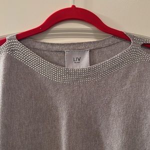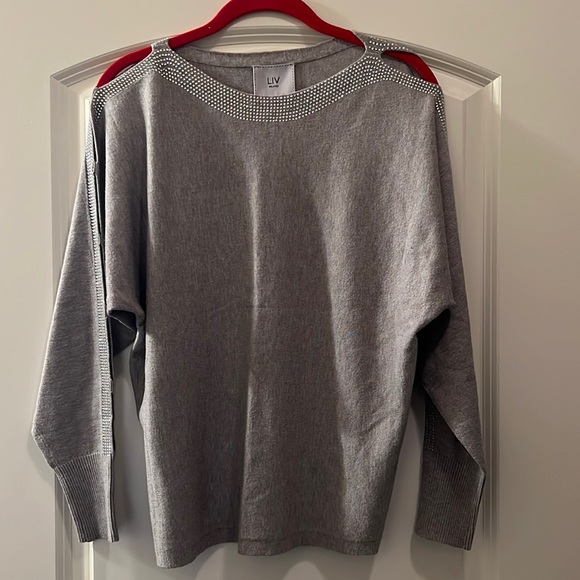 Lovely Liv Milano sweater with rhinestones. Openings down the arm lined with rhinestones. Color gray size medium in excellent condition.