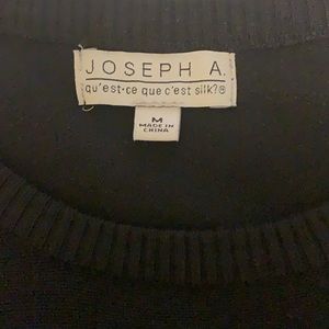 Black sweater with white ruffle detail down the sides. Pearl embellishment on top of 3/4 length sleeves. Side slit approximately 1/4 of the way up. In excellent condition