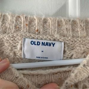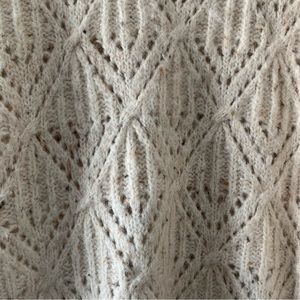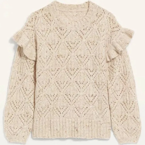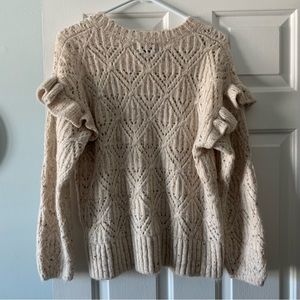 Beautiful speckled beige/cream sweater with ruffles on the shoulders!