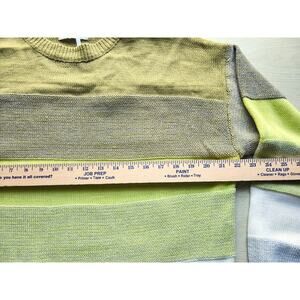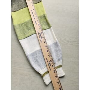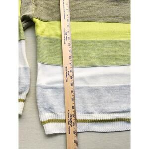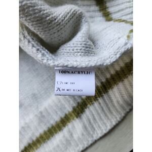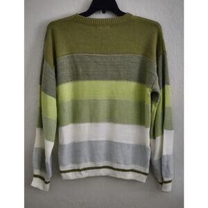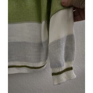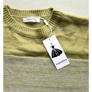 Sweater by Angashion. This sweater has large stripes. The top stripe is an avocado green, the next is a avocado green with silver metallic threads, the next is a spring green, the next is spring green with silver metallic threads, the next is white, the last is white with silver metallic threads. The stripe on the bottom sleeve cuff and bottom of the sweater are the avocado green. The sweater is SIZE X-LARGE. It is a nice sweater that is NEW WITH TAGS.