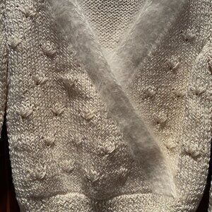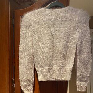 Sweater hand made with wool, rayon, and 100% angora. I showed the detail in the knitting on the front and the bottom of sleeve. Brand new and never worn. This is in white, like winter white. Size is XS.