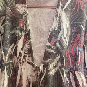 Original print. Sweater/jacket. Zipper starts from the middle of the chest down. Long sleeves and hoodie. Used, good condition.