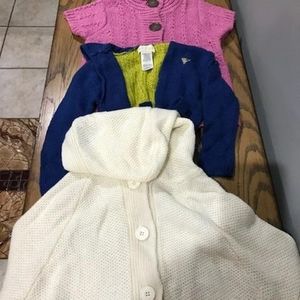 Good Condition Bundle of Guess blue & green Cardigan size 4, Guess beige poncho size 4 , Pumpkin Patch pink sweater short sleeve size 4