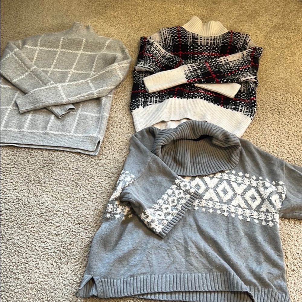 3 sweaters, Exxpress and NY & Company. 2 are size small and the darker gray with shorter sleeves is a Medium