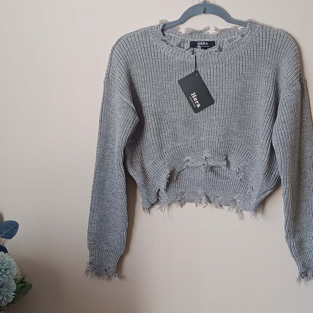 100% acrylic and dry clean. Hand wash and hang dry. Gray color and round neck line.