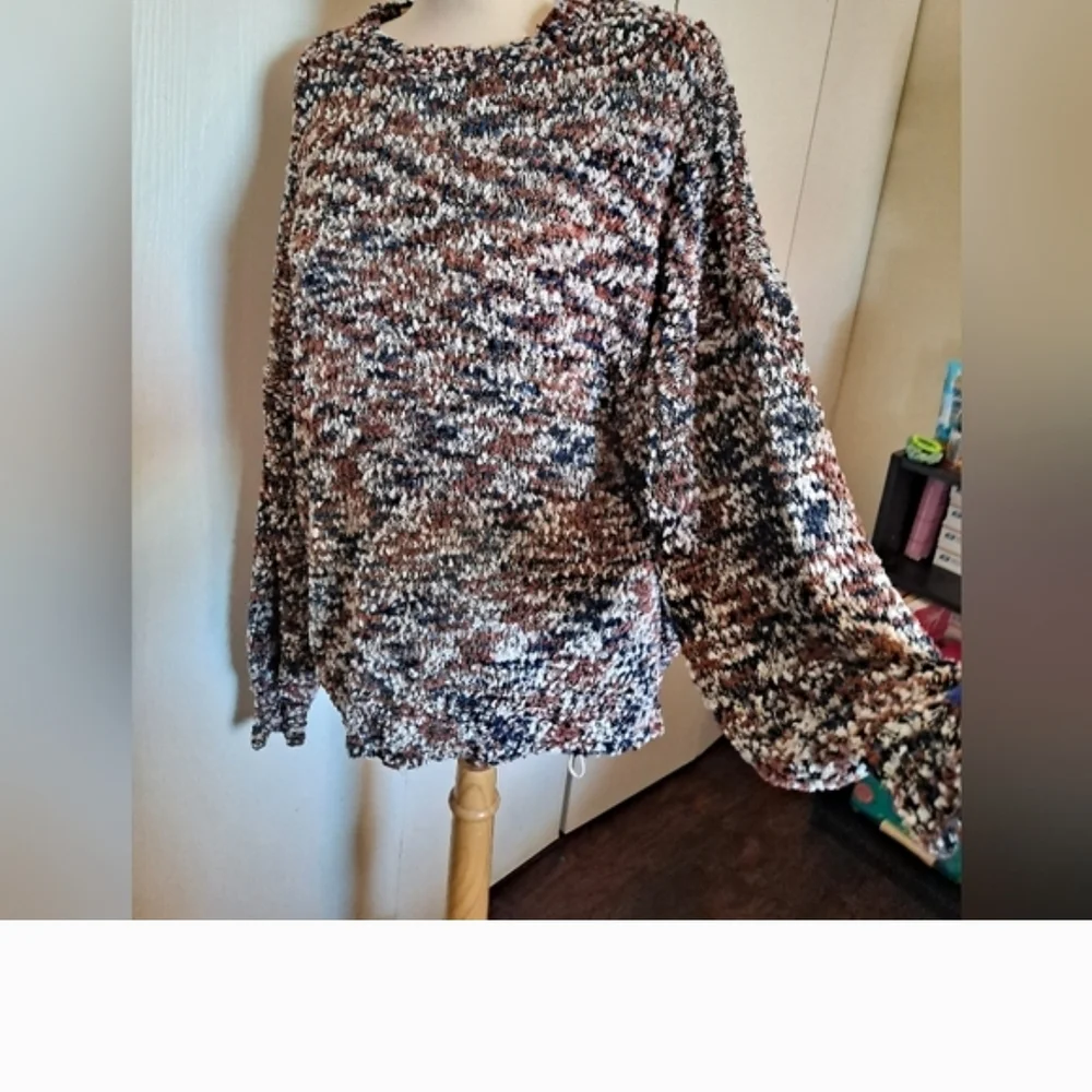 Cozy knit sweater with a mix of black, brown, and cream. Perfect for casual wear..