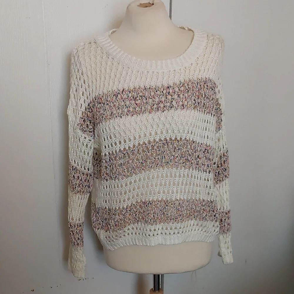 Chic knit sweater with cream and multicolor stripes. Ideal for layering and casual wear..