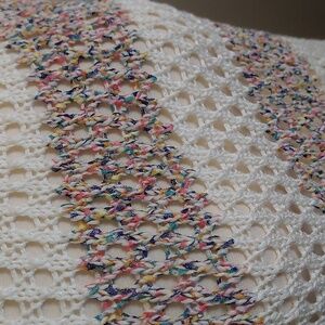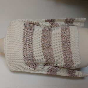 Chic knit sweater with cream and multicolor stripes. Ideal for layering and casual wear.