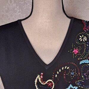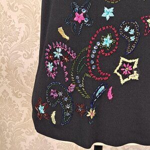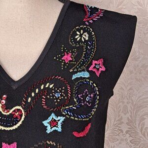 Sweaterworks Size Large Black Sleeveless Knit TOp Paisley Star Beaded Embroidery