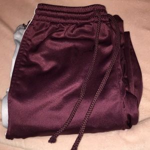 More of a burgundy color, two front pockets, one back zipper pocket on right side