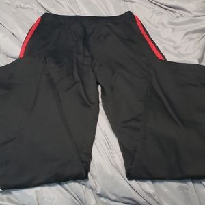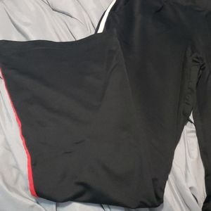 Black sweatpants with white stripe going down each leg in the front and red stripe going down each leg in the back amd it has pockets