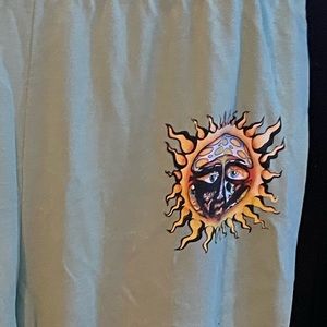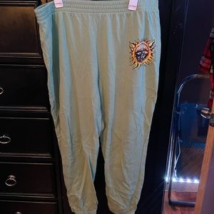 super cute light green sweatpants. They have a graphic of a sun design and fit very loose and comfortable.