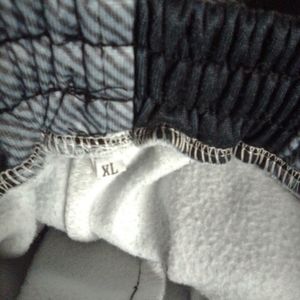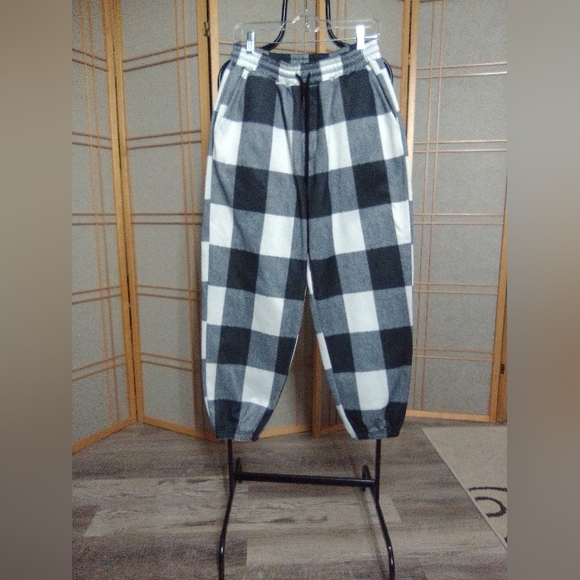 Black and white checkered sweatpants with elastic waist with pull tye. Slant front pockets. Polyester outer and flannel lining