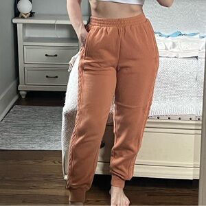 Good used condition sweatpants with braided side details. Color more like terracotta