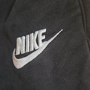 Classic black joggers from Nike. Elastic waistband and tapered cuffs. Simple embroidered logo on thigh. Soft fabric for daily wear. Versatile sporty look.