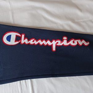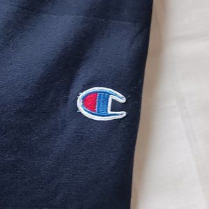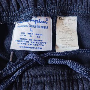 Sweatpants, Champion, embroidered Champion logo on leg, "Champion" decal decoration on leg, cuffed legs, navy blue, 100% polyester, made in Egypt. Tagged as a Size L, Large. Without stretching the elastic waist band, it measures a little over 30 inches. It stretches comfortably to a 36 waist. (The Champion official size chart states a large is 36 to 38, but I don't think 38 would be comfortable in these.) The inseam measuring from the crotch to the outer edge of the leg cuff is 30 inches. Pre-owned item in good condition, very light use, no holes, no tears, no stains.