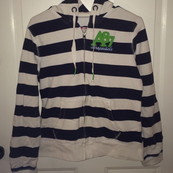 White and dark blue striped long sleeve zip-up sweatshirt with lime green writing . Gently worn. No stains or tears.