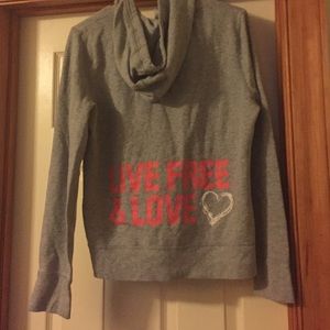 A grey sweatshirt with coral writing on the back in good condition.