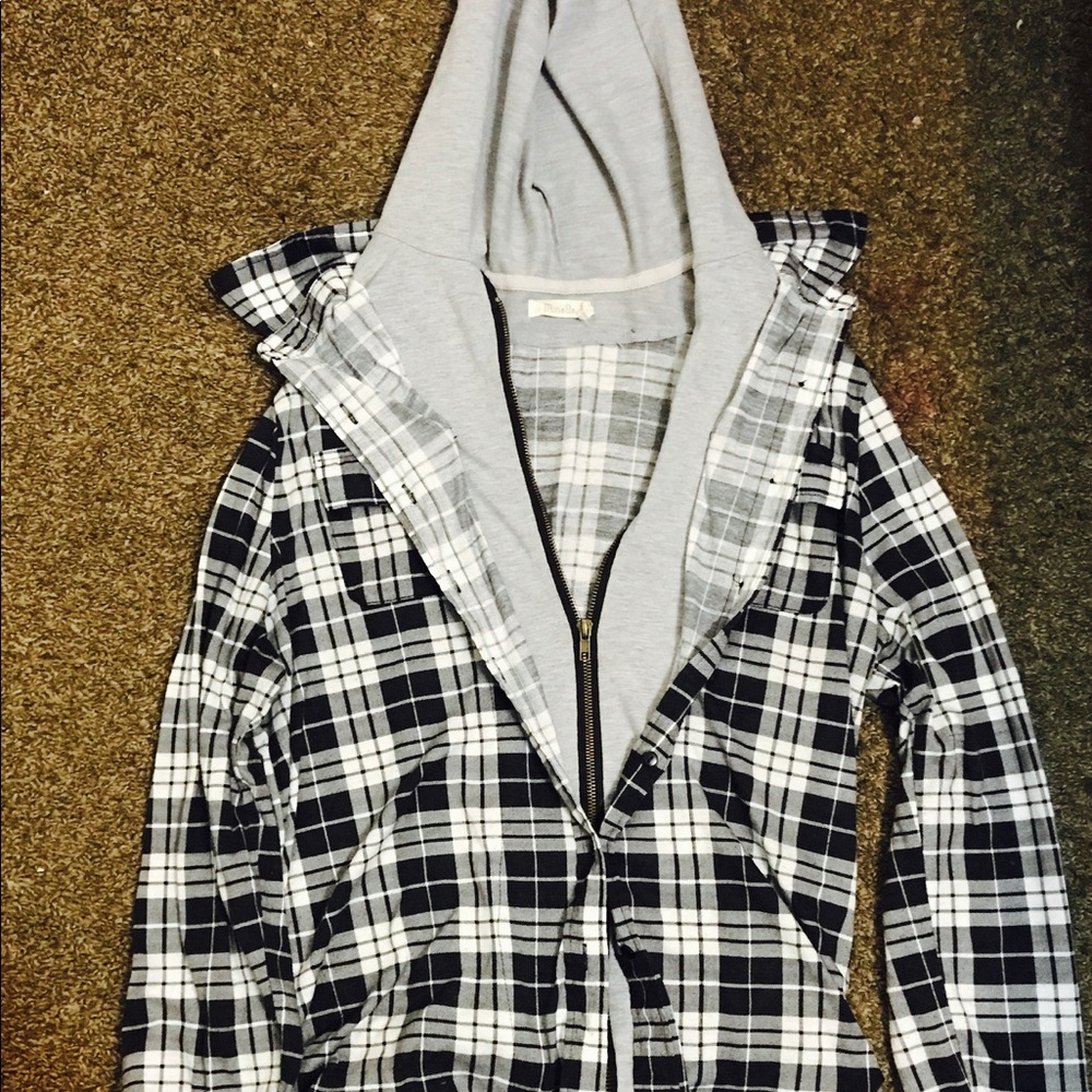 Black and white plaid sweatshirt with zipper and button detail