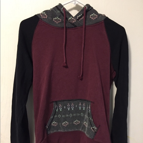Maroon with black sleeves and a tribal pattern on the pocket and hood!