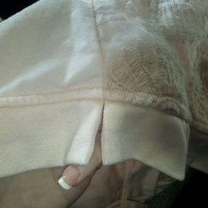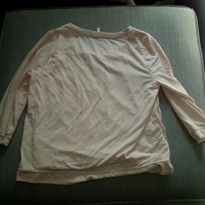 Light pink. Flower pattern on front. Plain back. 3/4 sleeves. Like new condition. Small side slits. Ripped tag inside.