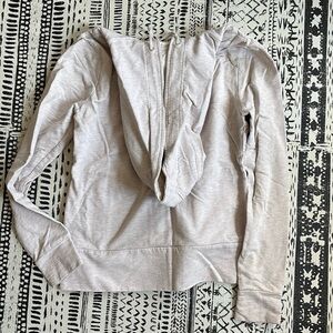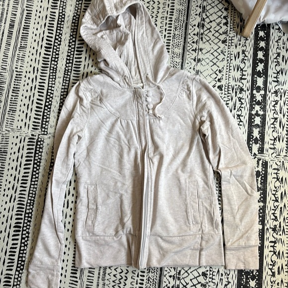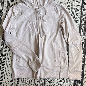Great gently used zip up hoodie! Fun button detail with full zipper. Off white heathered cotton. So cute just doesn't fit me anymore!