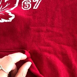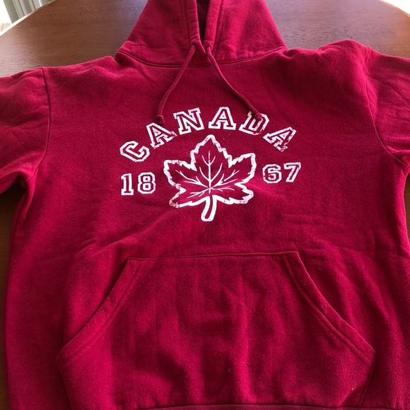 Sweatshirt from canada. Has a little rip in the corner of the front pocket as you can see in the third picture. Plain red back.