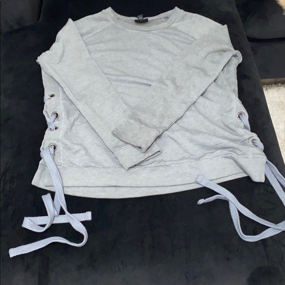 Fleece lined pull over sweatshirt with side ties that are able to tighten