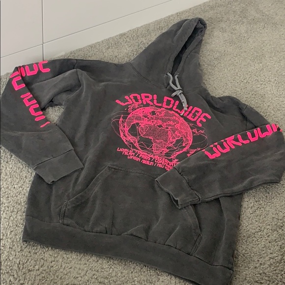 Size large hoodie but fits like a small. I thought it was going to be more oversized, supperrr cute though.