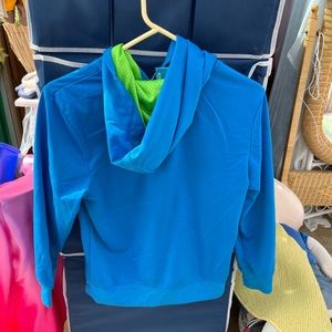 Made w polyester, mesh hoodie, brand is “active” by old navy