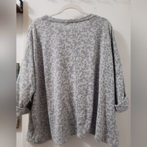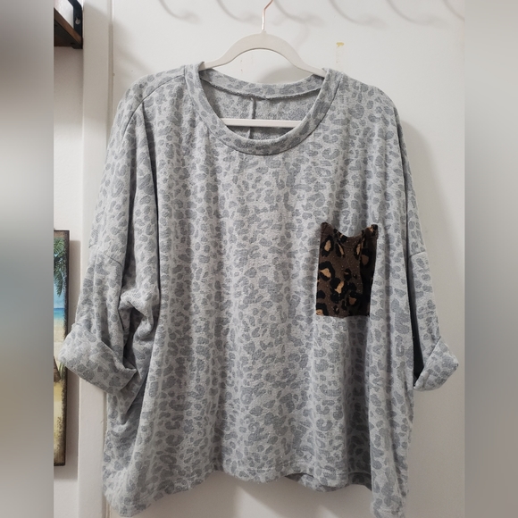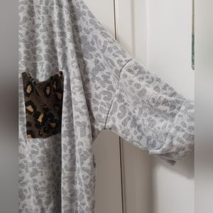 Gray leopard print, oversized, pocket. I cut the tag off and don't remember the brand.