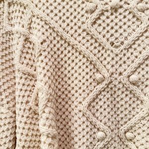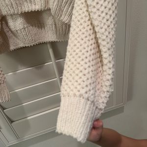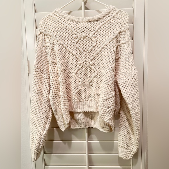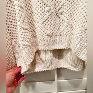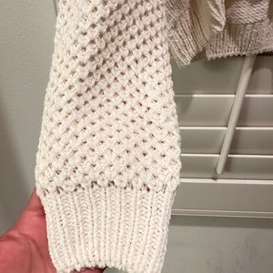 Beautiful sweatshirt with nice details soft and normal stretch. New. Very soft perfect for layering because it’s not too bulky it is also not a long sweater