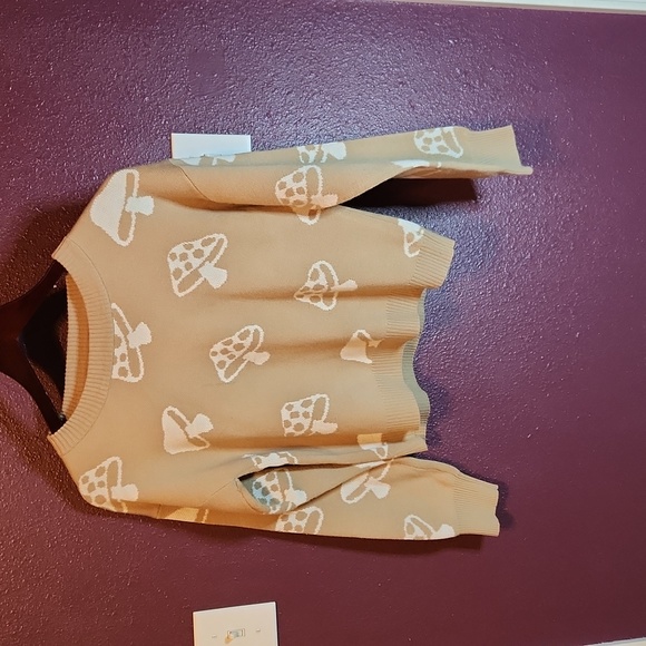 A tan sweatshirt with a white mushroom pattern stretching across the whole sweatshirt. Size S in Womens.