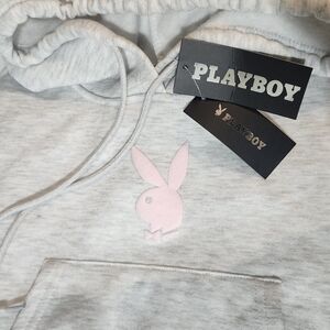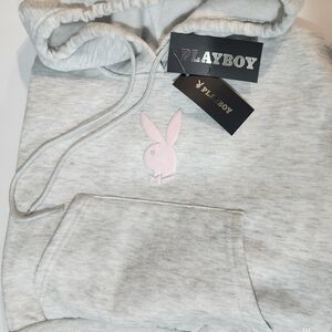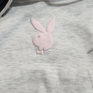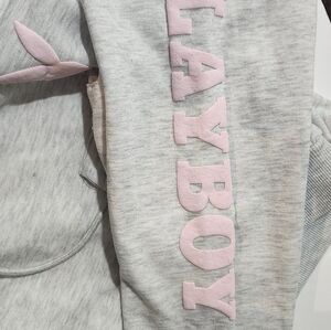 light Grey hooded sweatshirt, light pink playboy written on arm and bunny in front with pockets