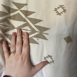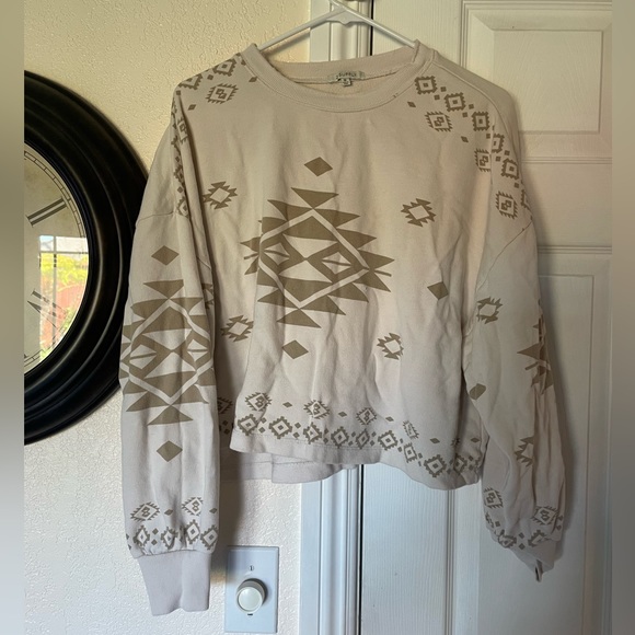 Z supply sweat shirt. So cute on! Slightly cropped but still great length. Arms are adorable and oversized. There is a tiny hole as pictured.