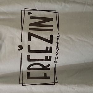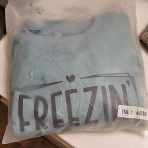 oversized large women's sweatshirt . sage green with black lettering that says "freezin season" . ptp 22