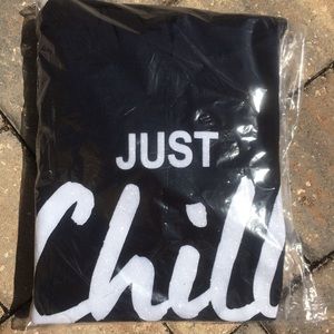 "Just Chill" fun graphic front lettering in white sparkle glitter.