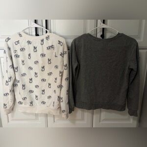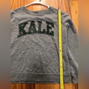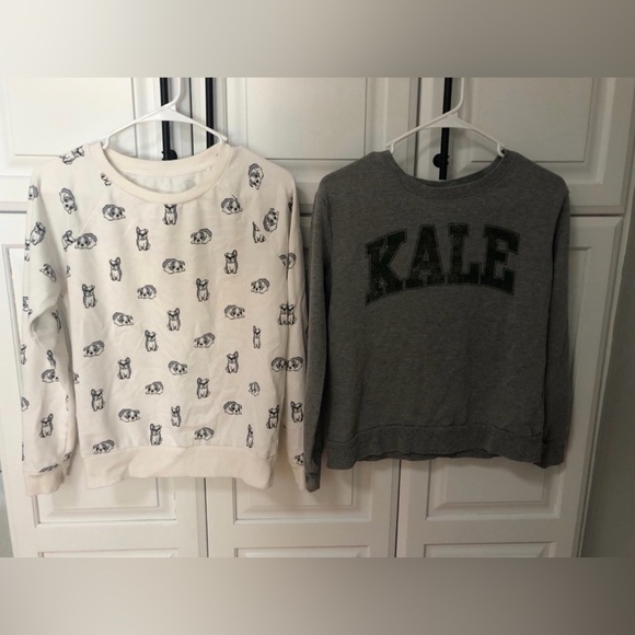Women’s juniors size XS sweatshirt bundle. Both light sweatshirts . Dog print sweatshirt is forever 21 brand with no inner label tag with sizing so please rely on pics for measurements. Kale sweatshirt is stranded brand XS. Both preowned with normal wear but in good functional condition. Please see pics for features. Thank you.