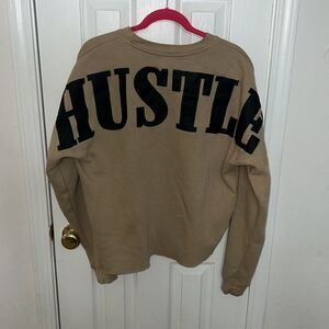 Stylish tan sweatshirt featuring a yellow smiley patch. Perfect for casual wear. Hustle printed on back no rips tears or fading cut off style on bottom