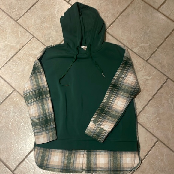 Hooded sweatshirt. Solid green in front with green and tan plaid sleeves he’s and back. Gives the look of wearing a flanned shirt underneath. Soft fabric.
