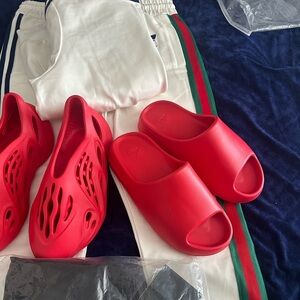 The shoes is a size 10 one pair  sweatsuit says a size 3X but it runs like small so like a 2X  the free the shirt   cologne is a sample for the picture 3X but it runs small like a 2X Please look at all pictures no returns. No boxes. Taking reasonable offers. The last picture is just a sample the one with