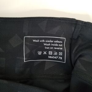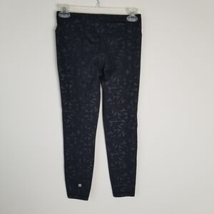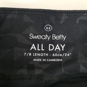 Gently used Sweaty Betty All Day 7/8 Leggings in a size XS. Color is black with an iridescent emboss geometric print all over.