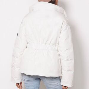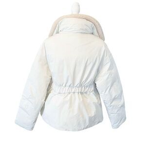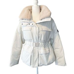 Alpine ski jacket in lily white from Seeaty Betty London. Brand new with tags. Belted waist, removable powder skirt and faux fur collar trim. Approximate Length from Shoulder to Hem: 27"