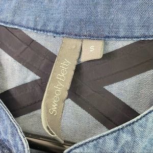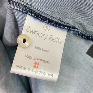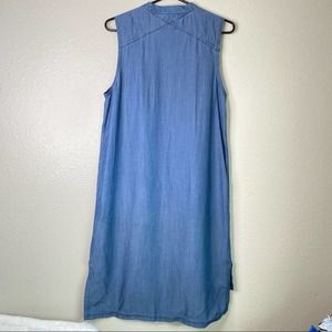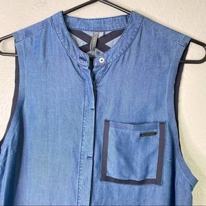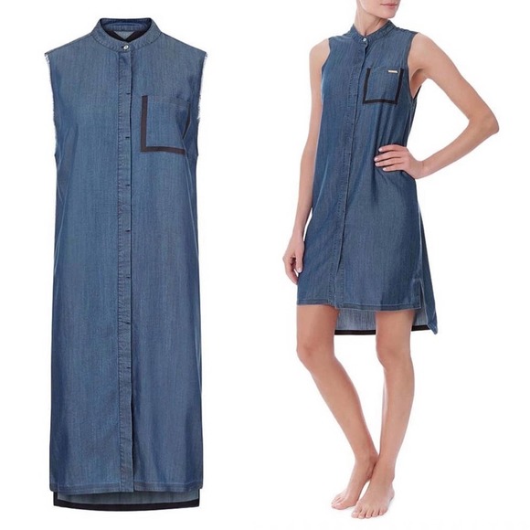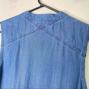 This loose fitting denim shirt dress is a spin on a classic. Constructed in soft, loose fitting lightweight chambray fabric with a statement laser cut pocket, this sleeveless dress is made to throw on warm days. Chambray style fabric is soft and lightweight on skin. Sleeveless with a laser cut pocket and stepped hem. Layer over leggings and roll neck knitwear.