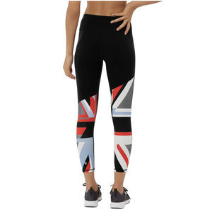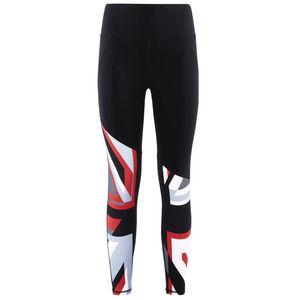 Sleek black leggings with bold red and blue patterns. Ideal for active wear.