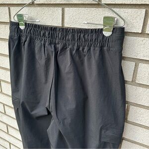 Sweaty Betty black Trekker Hiking Pants in a lightweight, durable technical fabric. Designed with a high-rise elastic waist and adjustable drawcord, multiple utility-style pockets, and zip hems for easy layering over hiking boots. Water-resistant, quick-dry, and crease-free material ensures comfort on the trail or for everyday wear. Perfect for travel, outdoor adventures, or casual sporty looks. Excellent used condition, size Large.