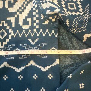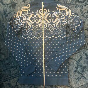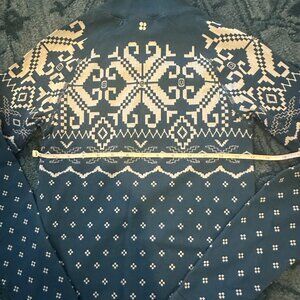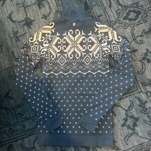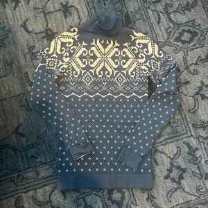 Stylish blue sweater with intricate cream patterns. High neckline. Long sleeves. Perfect for cozy days.
