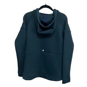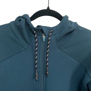 Sweaty Betty Cross Train Full Zip Hoodie Jacket in Teal. Midweight hoodie. High collar. Full zip. Drawstring hood. Side pockets.