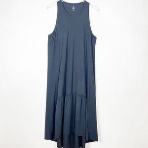 - A gently ruffled high low hem elevates the easygoing feel of this flowy midi dress. Perfect for relaxing in after a workout.