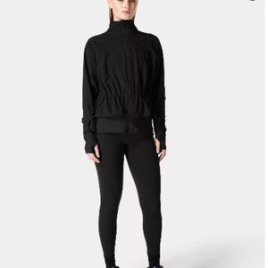 Sweaty Betty "Fast Lane" feminine high-performance running jacket in a flattering cinched-in silhouette